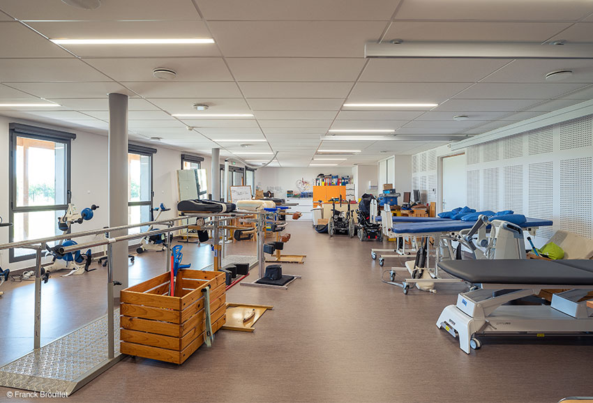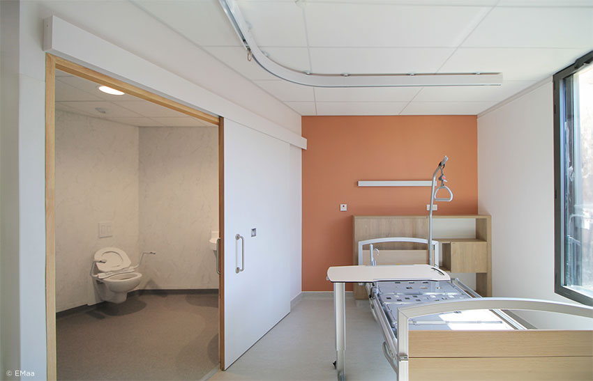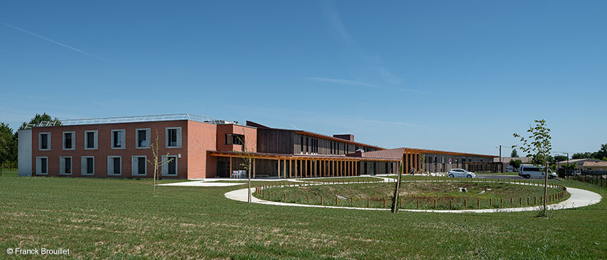 UN CHALEUREUX ORIGAMI Cette technique de pliage japonaise, appliquée à une architecture du soin, présente un intérêt pour l’intégration au site. Cette plaque qui part presque du sol et qui s’élève lentement vers le ciel, transcende un terrain dépourvu de fortes caractéristiques, et adoucit l’impact d’un volume sur deux niveaux posés sur un terrain plat. Le biais que la façade principale présente par rapport au croisement par lequel on accède à la MAS, génère un espace végétalisé au Sud-Est qui l’éloigne de la rue et permet d’identifier l’entrée de loin. Elle est favorablement orientée et s’ouvre sur une agréable vue lointaine sur les Pyrénées. La feuille pliée qui devient toit, affiche une continuité dynamisée par quelques plis judicieusement positionnés. Elle présente une pente qui absorbe progressivement les deux niveaux et génère en dessous une volumétrie intéressante et une continuité dedans/dehors. Les lignes de fuite, la double hauteur en retrait et le fractionnement de la grande façade en différents volumes fonctionnels confèrent au bâtiment l’échelle domestique d’une grosse maison, façon d’introduire un rapport à taille humaine entre édifice et usagers. Les volumes simples des unités d’hébergement sont revêtus de terre cuite. Ils s’adossent à l’origami. L’extérieur du bâtiment se décline selon un camaïeu de tons chauds qui va de la terre cuite des unités d’hébergement au bois des espaces de vie, en passant par le zinc rouge terre du toit plié. Les aménagements intérieurs trouvent leur prolongement dans des espaces extérieurs adaptés aux patients. | |
