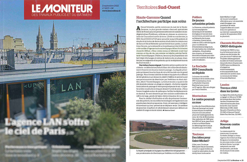 LEMONITEUR 1 juillet 2025 Article Collège de Maraussan « Équipements publics : un collège en pierre et bois conjugue sobriété et insertion paysagère à Maraussan »
