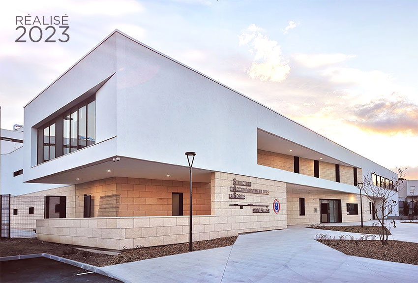 | STRUCTURE D'ACCOMPAGNEMENT À LA SORTIE (S.A.S.) À MONTPELLIER (34) ESPAGNO MILANI - Entreprise mandataire GCC - ARCHI 5 PROD - BETEM - EMACOUSTIC - CRONOS CONSEIL 7 309 m2 SP - 20 271 879 €HT - Concours lauréat 2019 / Réalisé 2023 |