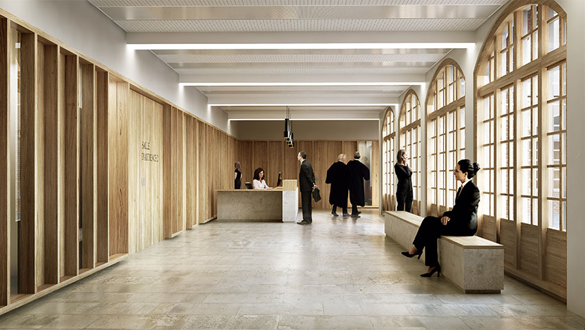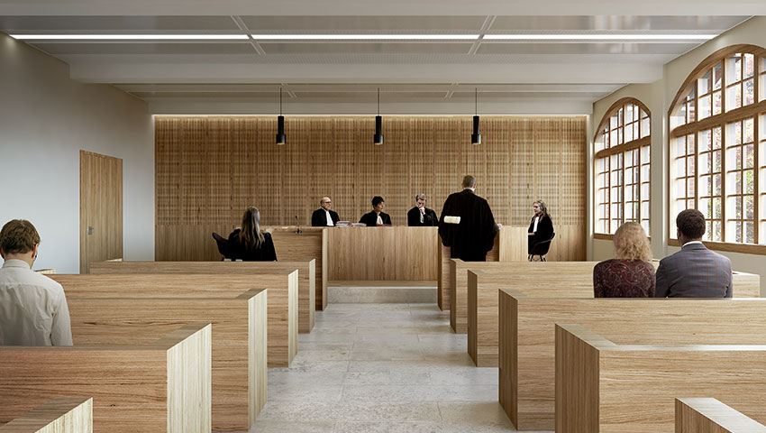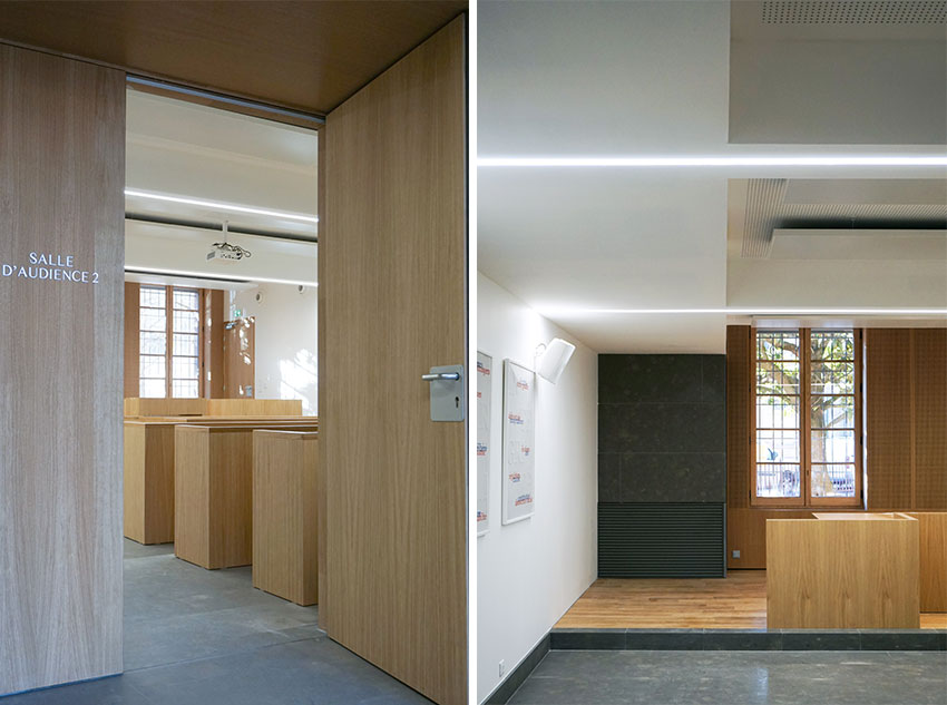 UNE RESTRUCTURATION AVEC DÉLICATESSE Dans un cadre bâti d’une forte qualité patrimoniale, les choix architecturaux s’attachent à en tirer le meilleur parti, sans intervention lourde de restructuration. Le projet propose un bâtiment accueillant mais aussi emprunt d’une juste solennité, tout en étant parfaitement fonctionnel pour les personnes qui le fréquentent ou qui y travaillent. La structure existante présente de belles opportunités : les grands volumes libres du rez-de-chaussée pour accueillir les salles d’audience et la galerie des pas perdus. Les escaliers existants, bien répartis et de belle facture, sont conservés. Les différents plateaux des étages, permettent une répartition équilibrée des différentes chambres et locaux associés bénéficiant des vues agréables vers l’extérieur. L’évidence des parcours dans le bâtiment, qu’ils soient pour le public ou le personnel, en facilite l’usage et participe de son agrément. Les aménagements intérieurs associent des matériaux à la fois nobles et chaleureux : le chêne dans les menuiseries et les panneaux muraux, la pierre naturelle pour les sols. | |